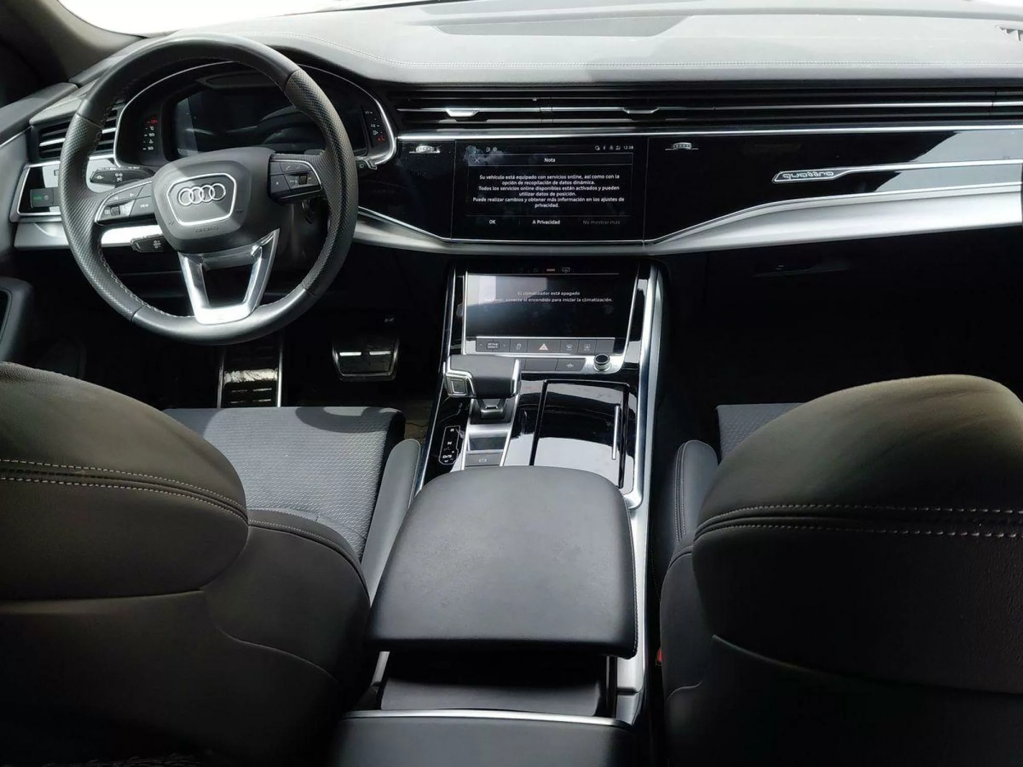 Dentro del Audi Q8, la calidad de los acabados se hace evidente en cada detalle. Con asientos deportivos ajustables eléctricamente y un volante multifuncional en cuero, cada viaje se convierte en un deleite. La cabina cuenta con inserciones en aluminio mate cepillado y un revestimiento interior de techo en tela negra, que acentúan su elegancia. Sin duda, el Audi Virtual Cockpit Plus de 12.3 pulgadas permite al conductor tener acceso rápido a toda la información necesaria de manera clara y dinámica.