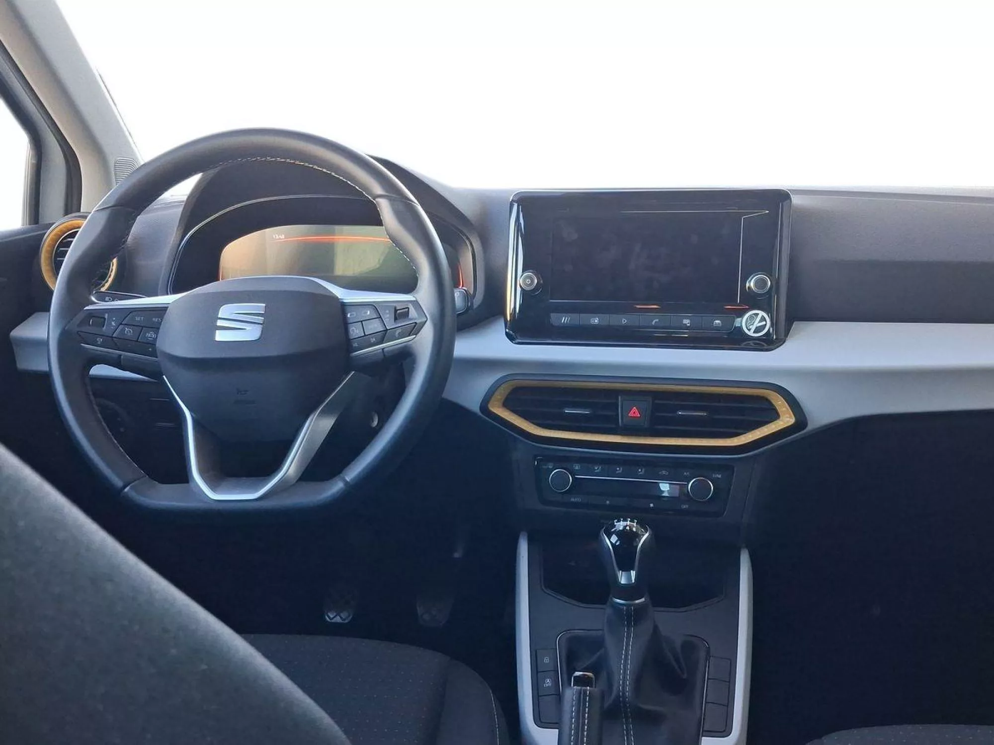 Al abrir la puerta, te recibe un interior bien diseñado con **tapicería de tela negra** y un cuadro de mandos **Digital Cockpit de 8”** que proporciona toda la información necesaria con claridad. Dispone de un completo sistema de infoentretenimiento que incluye una pantalla táctil **Media System Color de 8,25”, Full Link (Android Auto y CarPlay)**, y **Bluetooth**, garantizando que siempre estés conectado. Además, el **cargador inalámbrico** y los **puertos USB tipo C** están disponibles para facilitar el uso de tus dispositivos.
