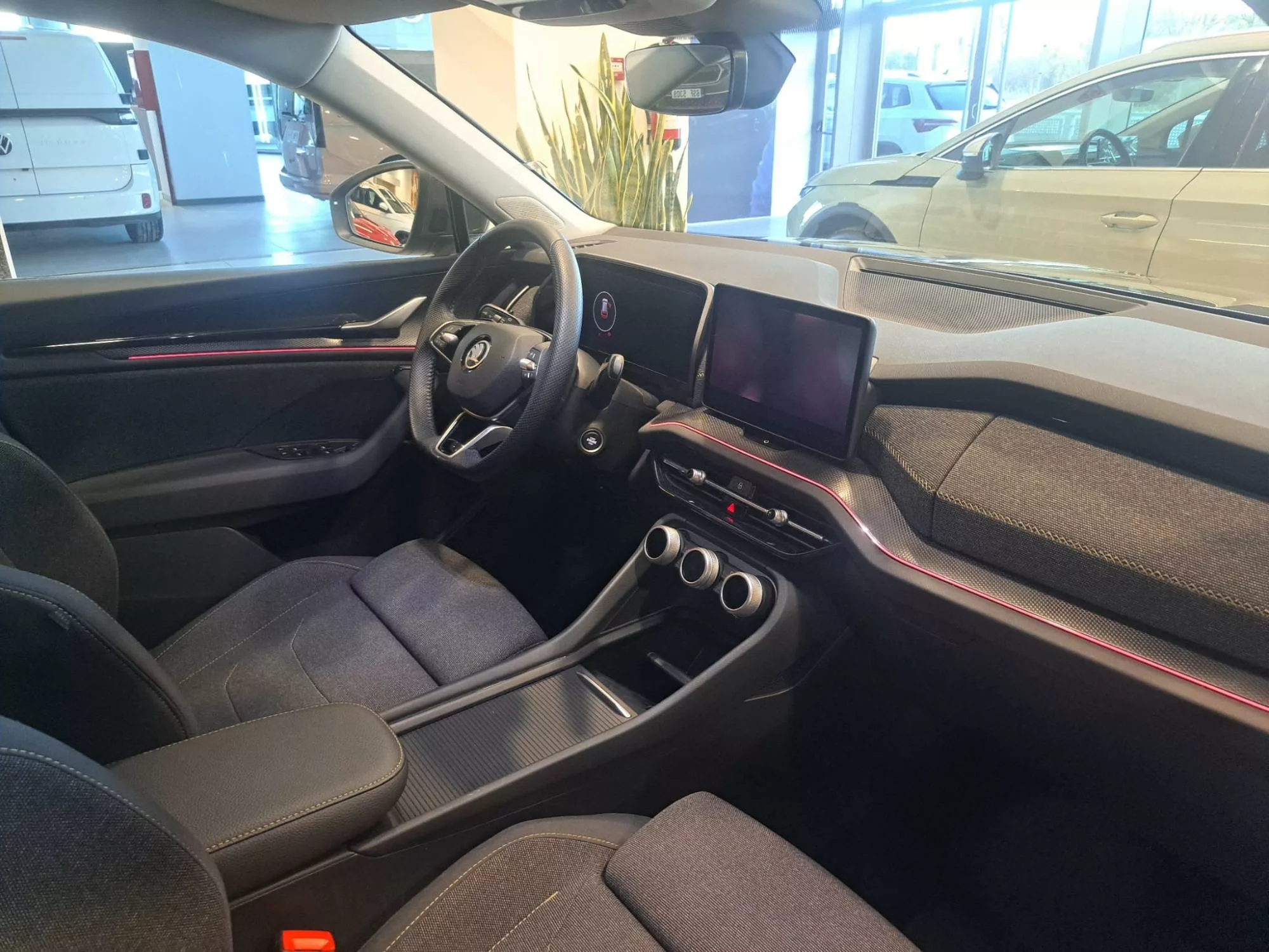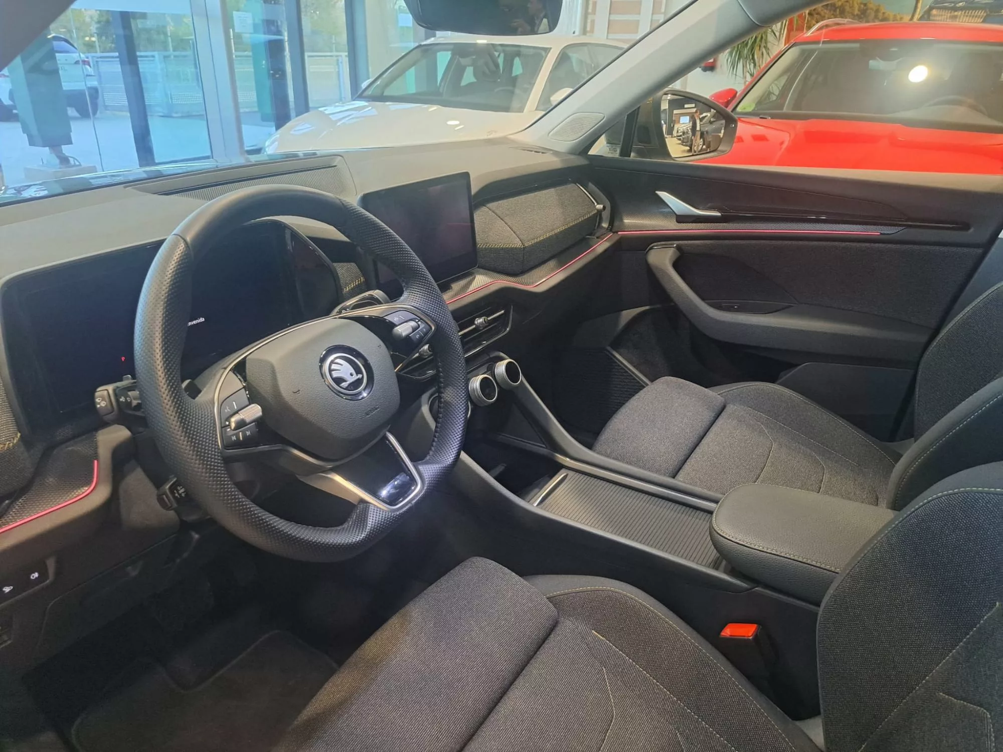 En el interior, el Skoda Kodiaq es un verdadero refugio de confort y tecnología. Dispone de un ajuste lumbar neumático para el asiento del conductor y ajustes eléctricos que garantizan la máxima comodidad. Los asientos deportivos de confort ofrecen un soporte excepcional, ideal para viajes largos. Además, el ambiente se realza con molduras decorativas en cromo y la tapicería Suedia de color negro, brindando una sensación de lujo.