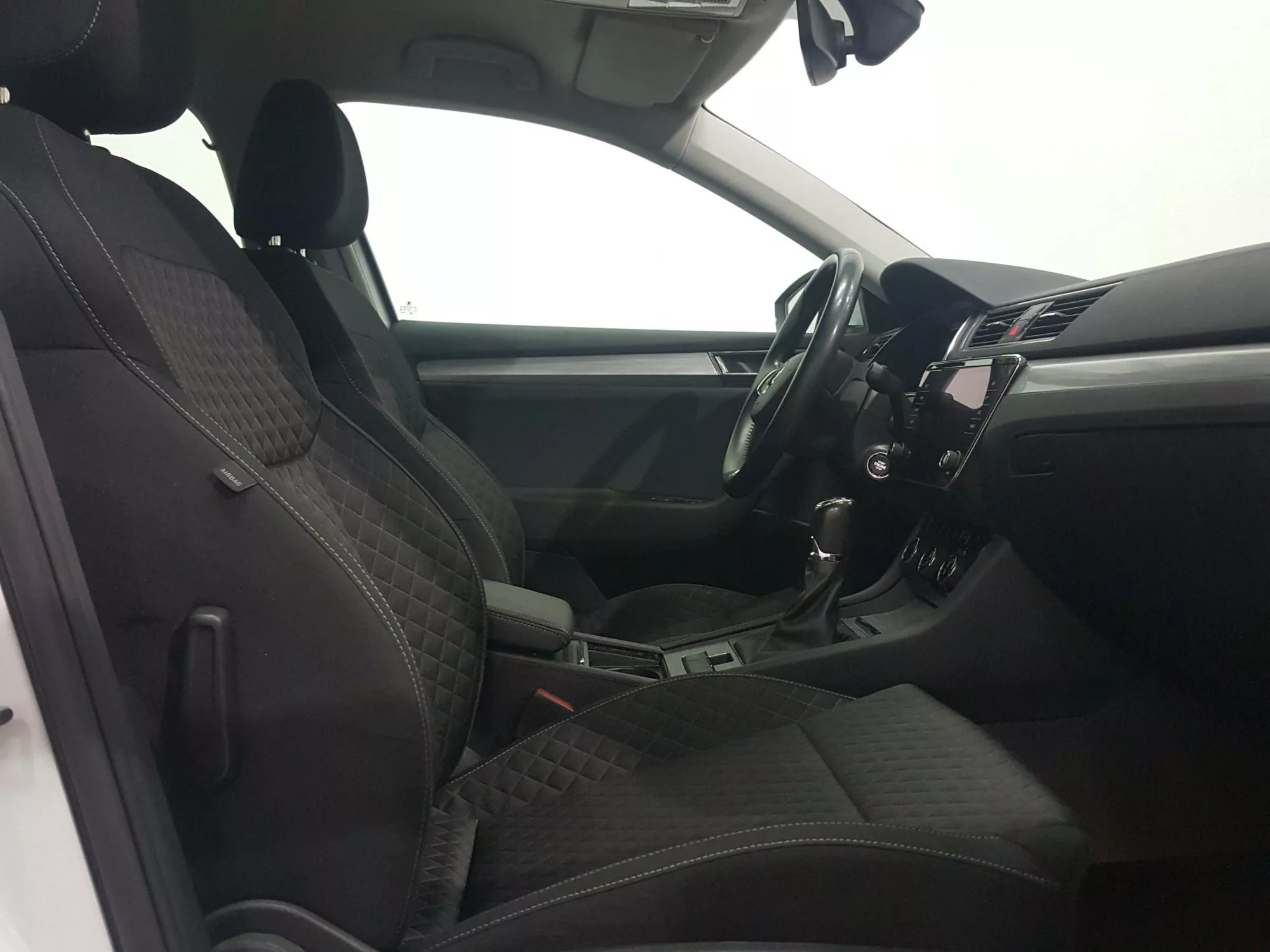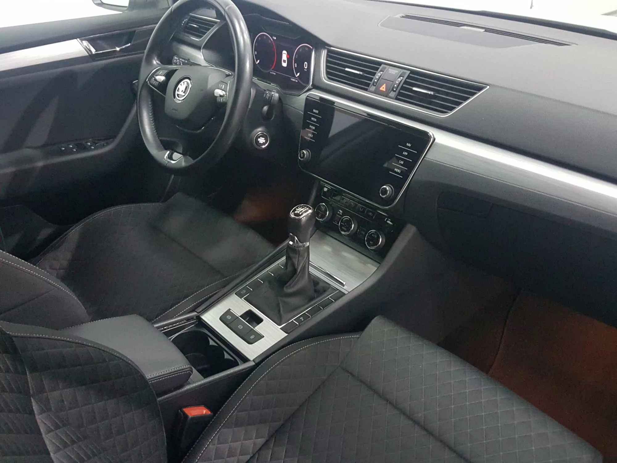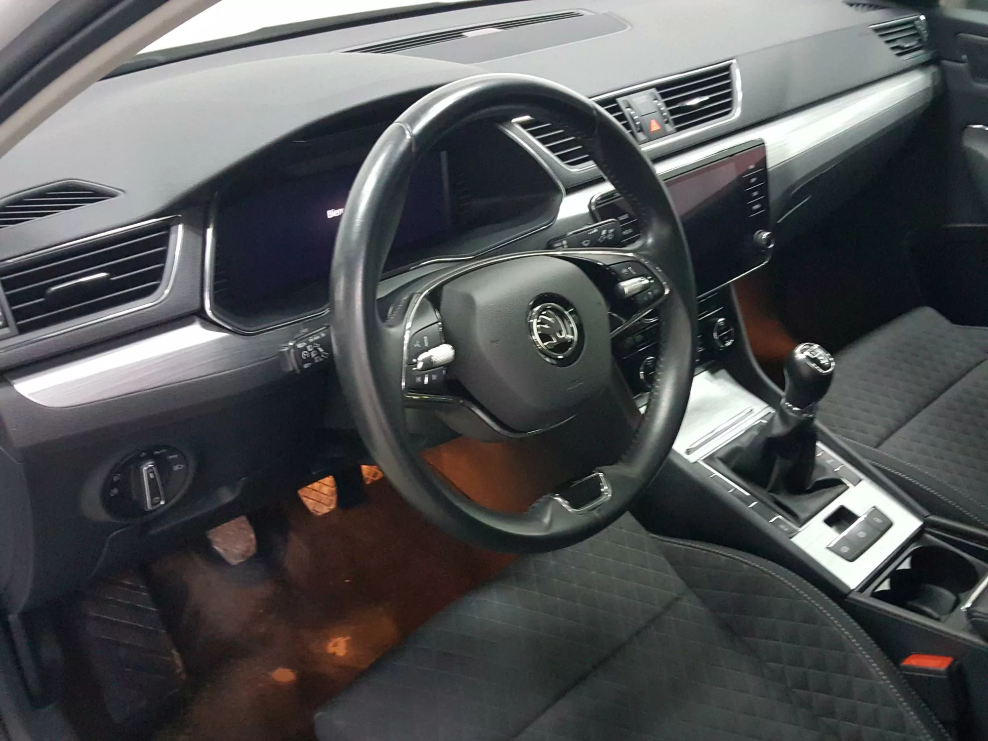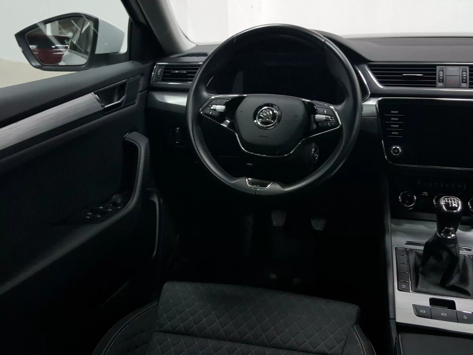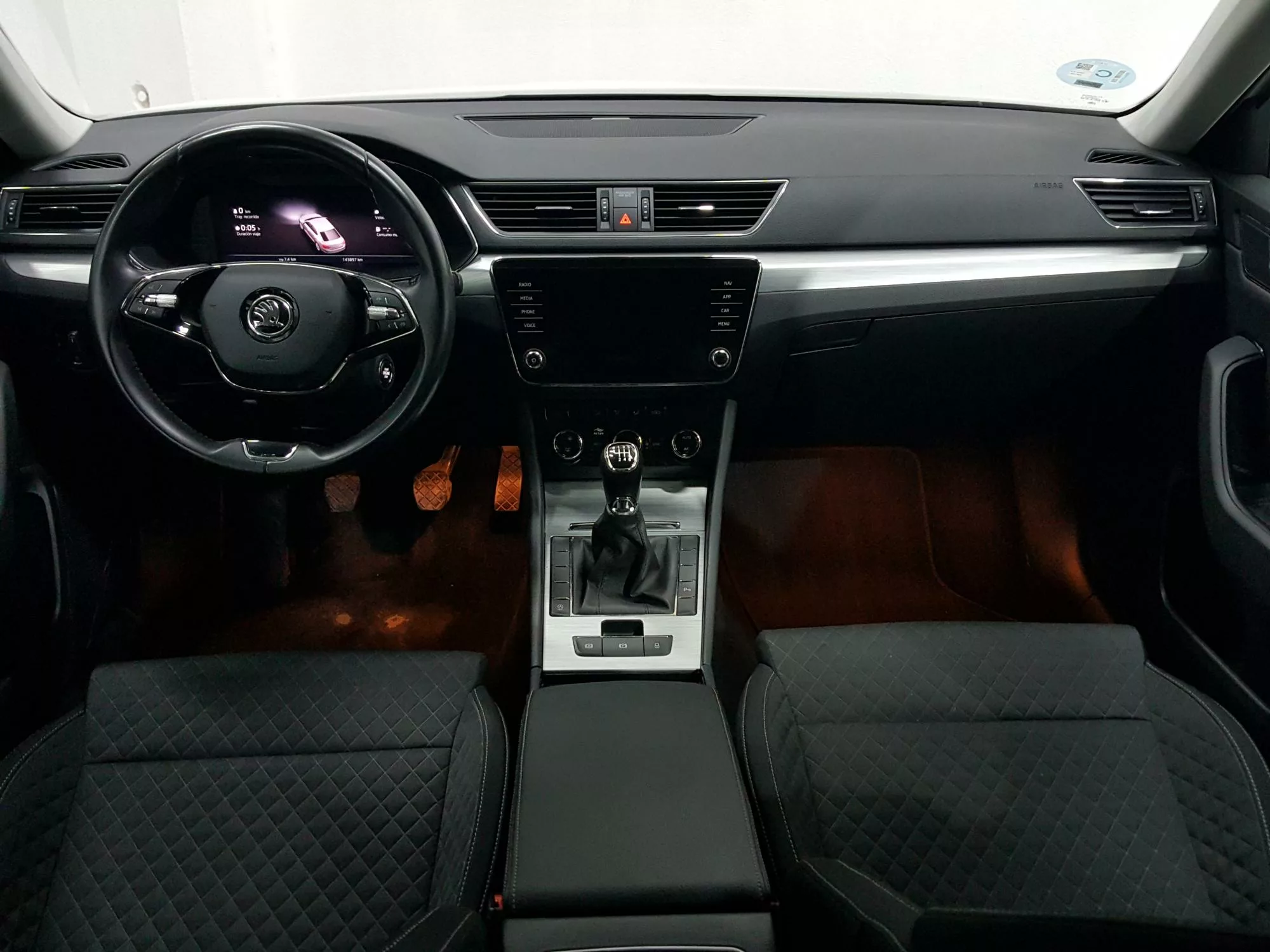 El interior del Skoda Superb destaca por su diseño moderno y funcional. Con una amplia cabina y los materiales de alta calidad, cada viaje se convierte en un placer. Los asientos tapizados en tela se adaptan perfectamente a la ergonomía, y la regulación lumbar manual de los asientos delanteros garantiza un soporte óptimo durante largos recorridos.