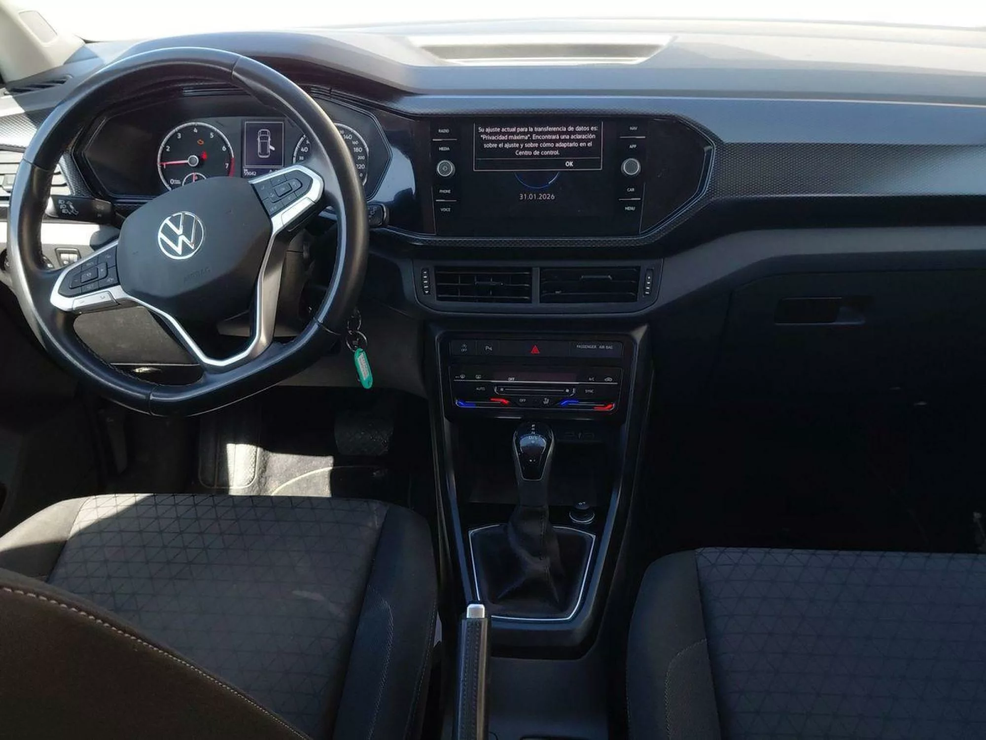En su interior, el T-Cross ofrece un espacio generoso y confortable para sus ocupantes. Equipado con tapicería de tela y un **pomo de palanca de cambios en cuero**, garantiza un toque de elegancia. La ***dirección asistida*** facilita el manejo en cualquier situación, mientras que el **volante multifunción de cuero con levas** permite un control total durante la conducción. El **aire acondicionado automático bizona Climatronic** asegura que todos los pasajeros disfruten de la temperatura perfecta.